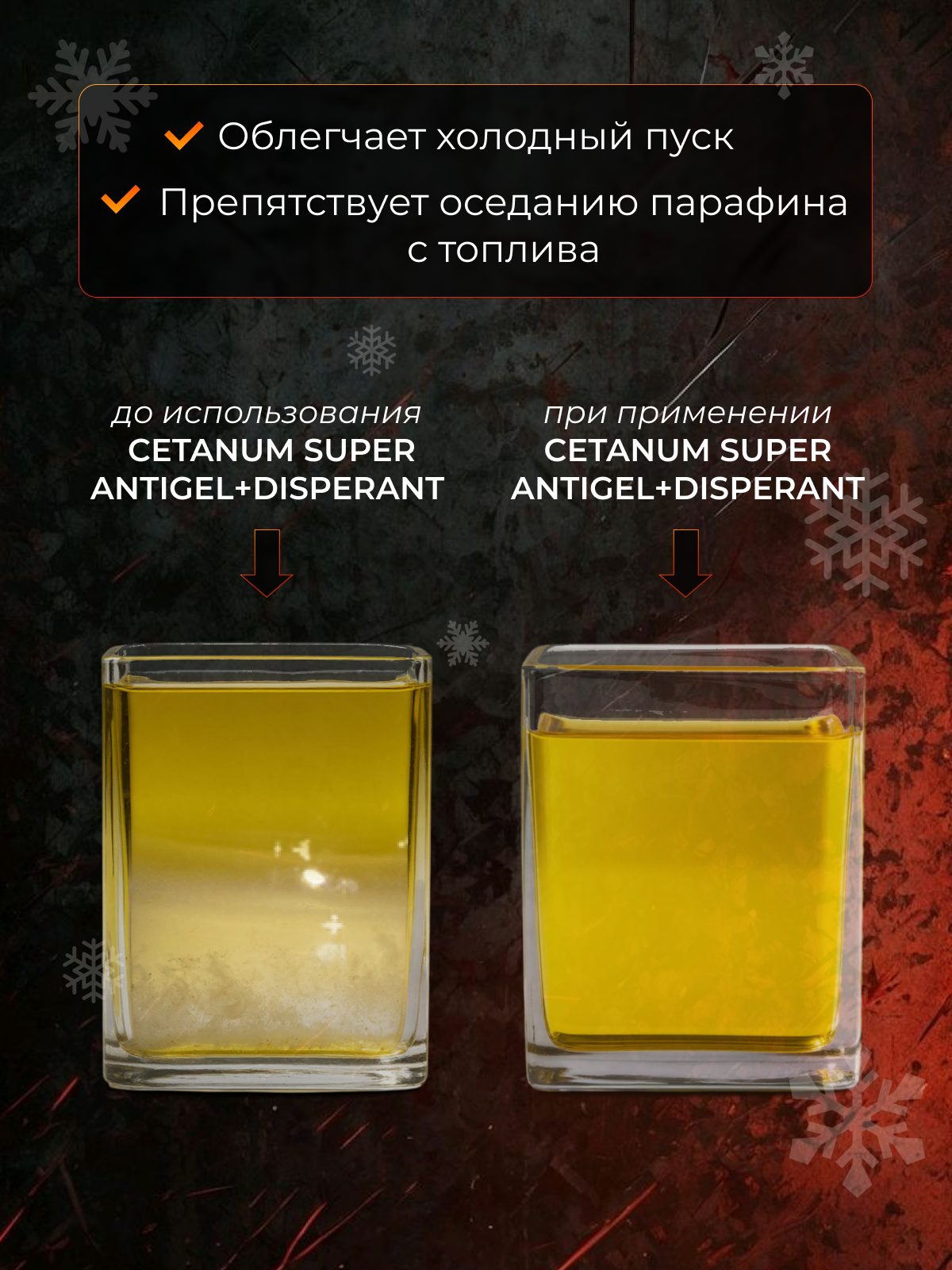 Присадка идеально подходит для дизельных двигателей любых типов, включая системы Common Rail, насос-форсунки и распределённые ТНВД, и особенно полезна в регионах с морозными зимами и перепадами температуры.